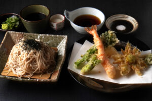 信州戸隠産のざる蕎麦、山菜のふきのとう、たらの芽、こごみ、菜の花がセットでお召し上がりいただけます。